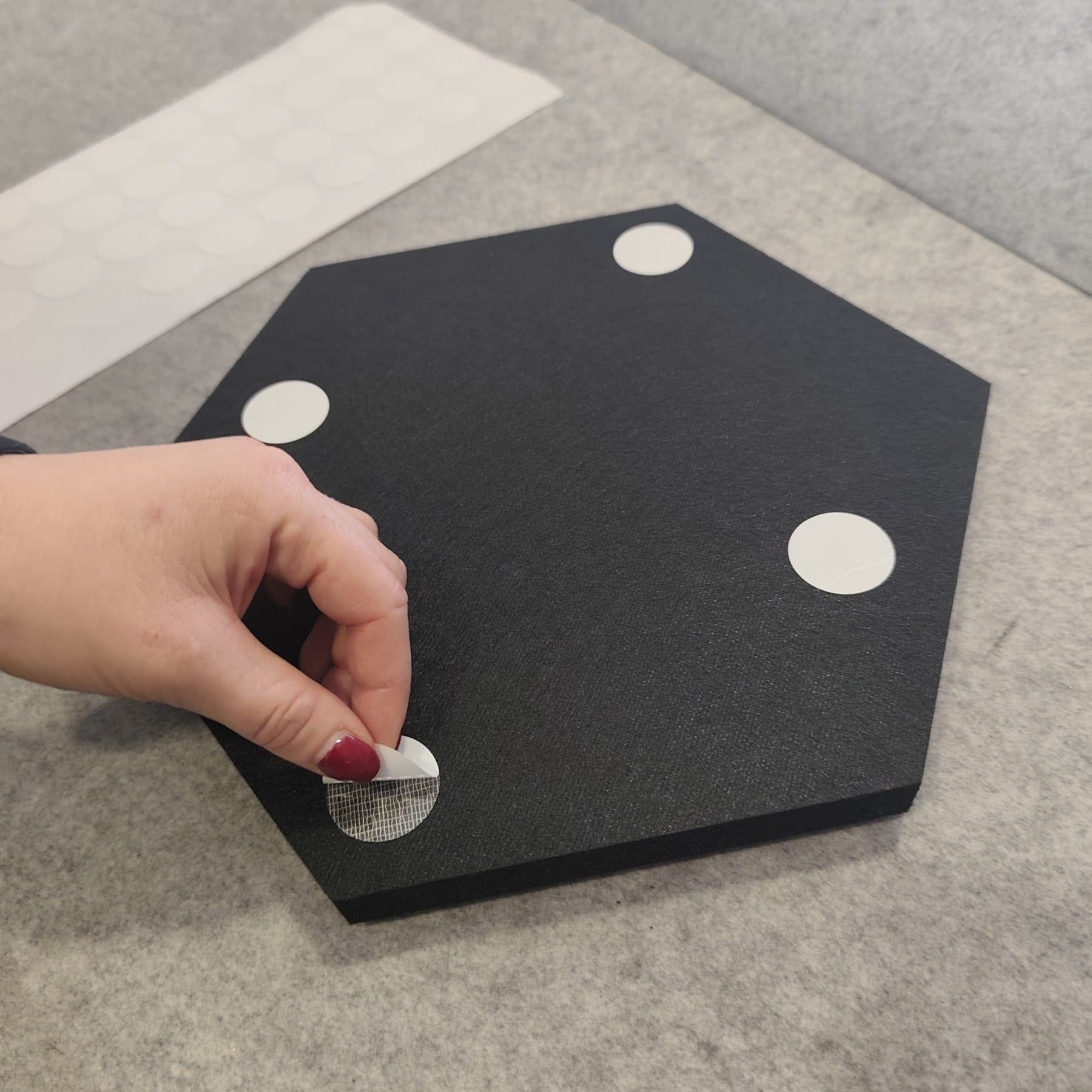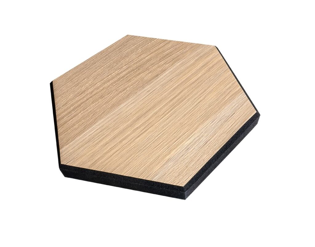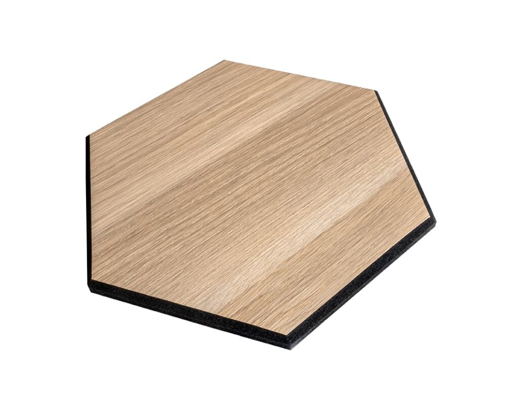 HexDeSil šesterokutni modularni elementi izrađeni od laminata bez melamina i formaldehida na podlozi od crnog filca od reciklirane PET ambalaže.
