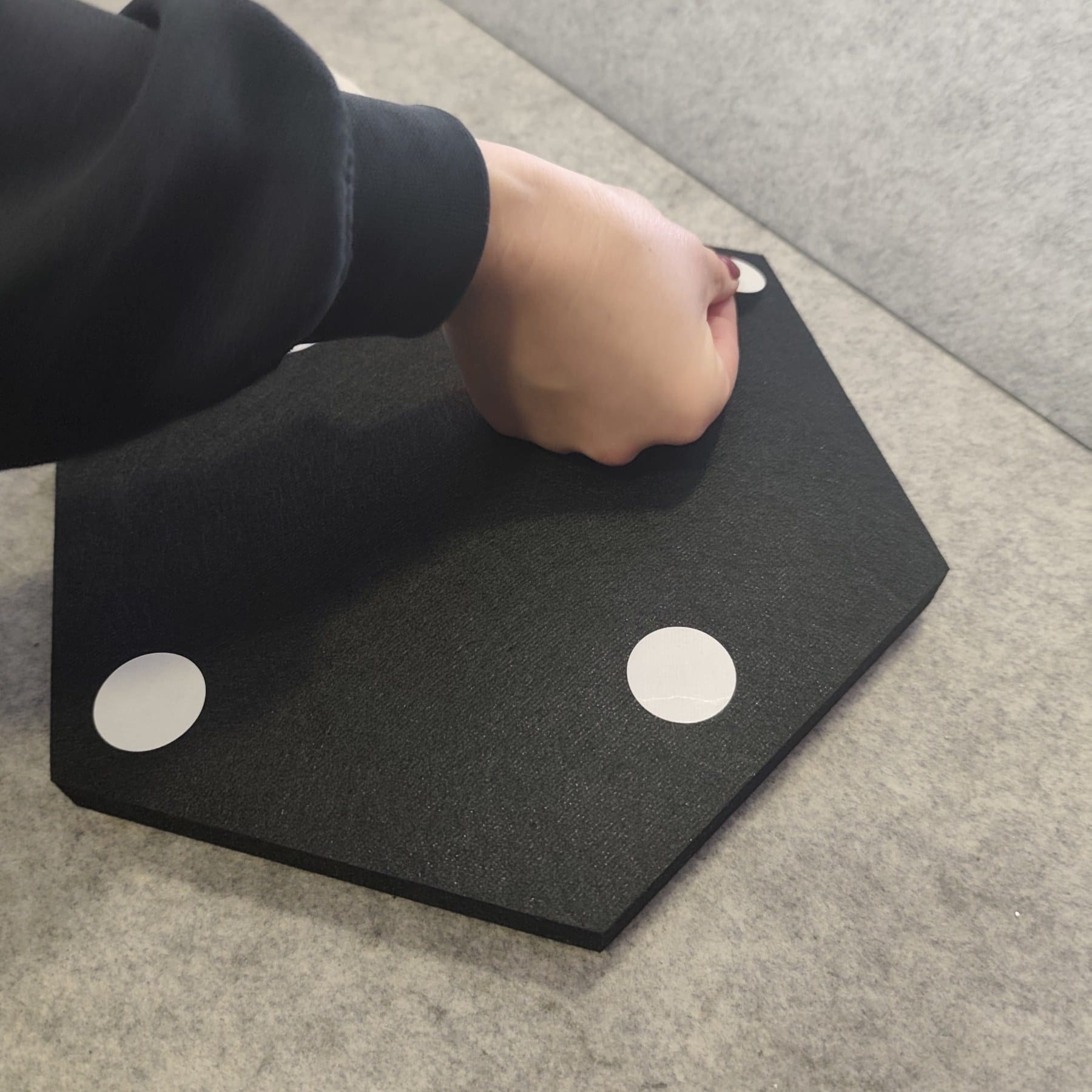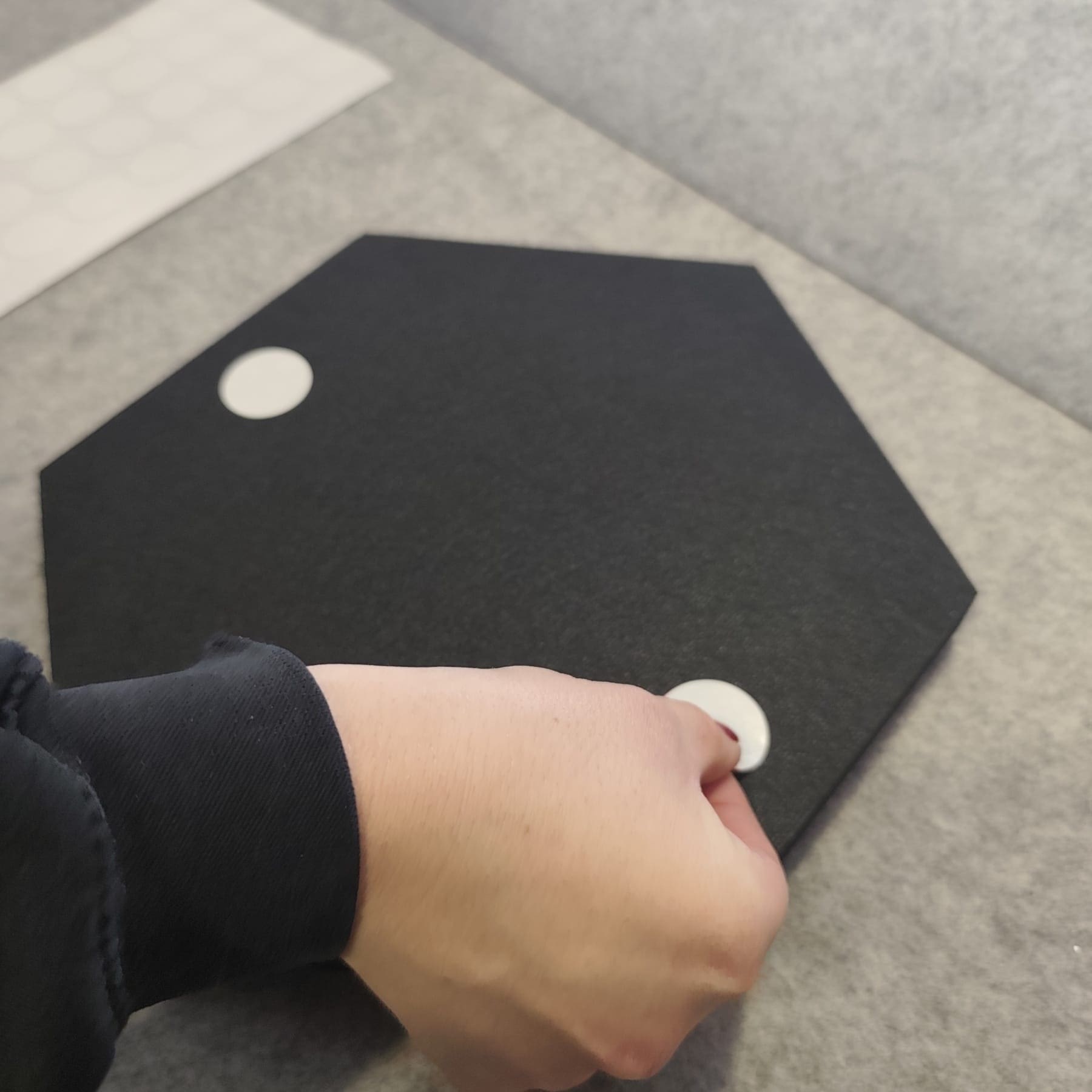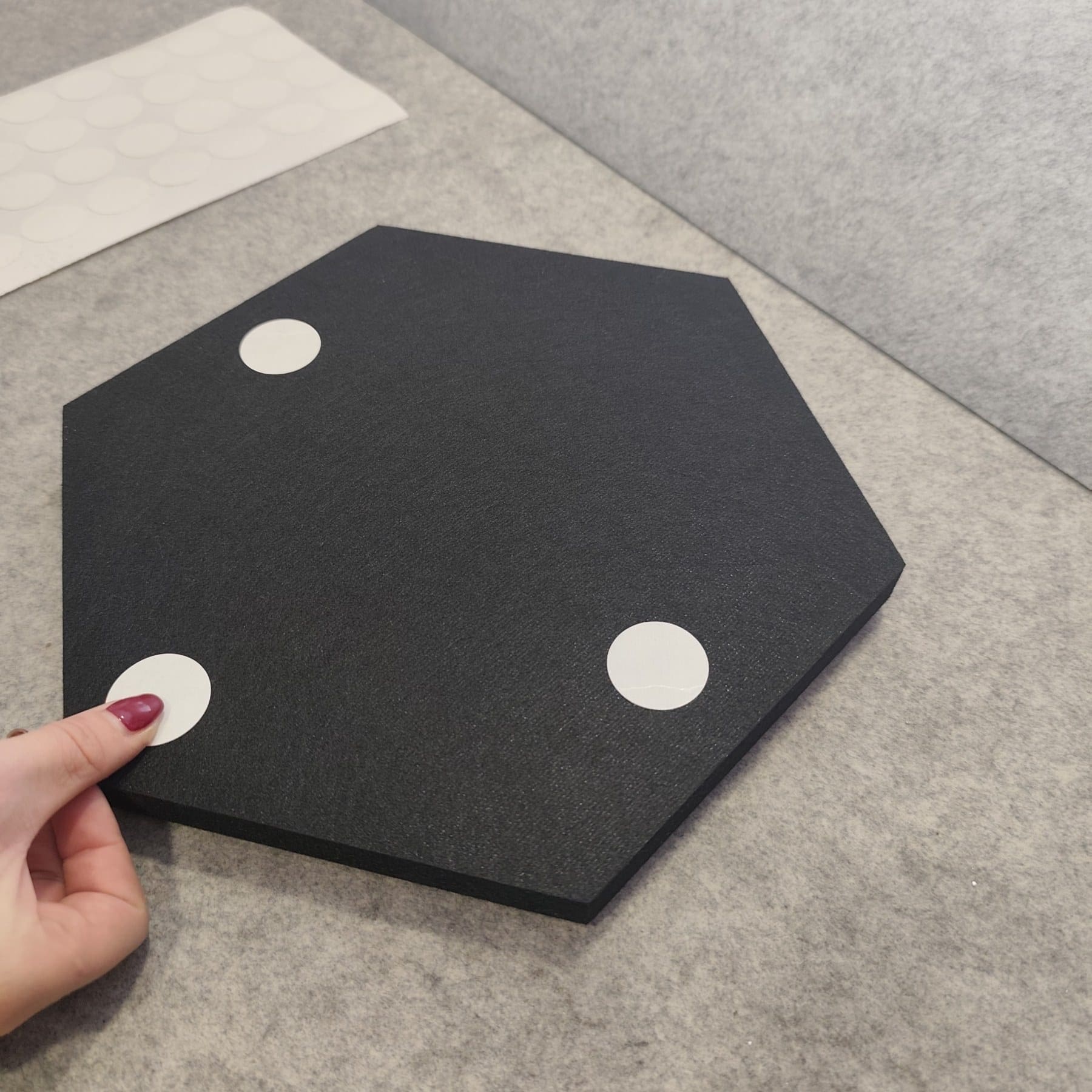 HexDeSil šesterokutni modularni elementi izrađeni od laminata bez melamina i formaldehida na podlozi od crnog filca od reciklirane PET ambalaže.