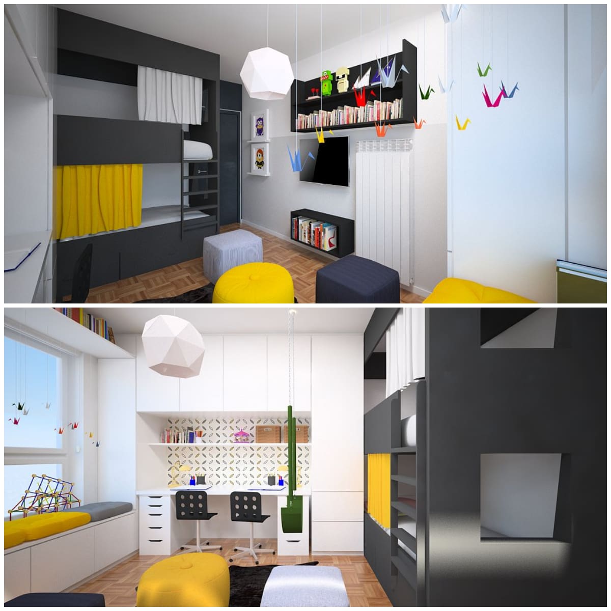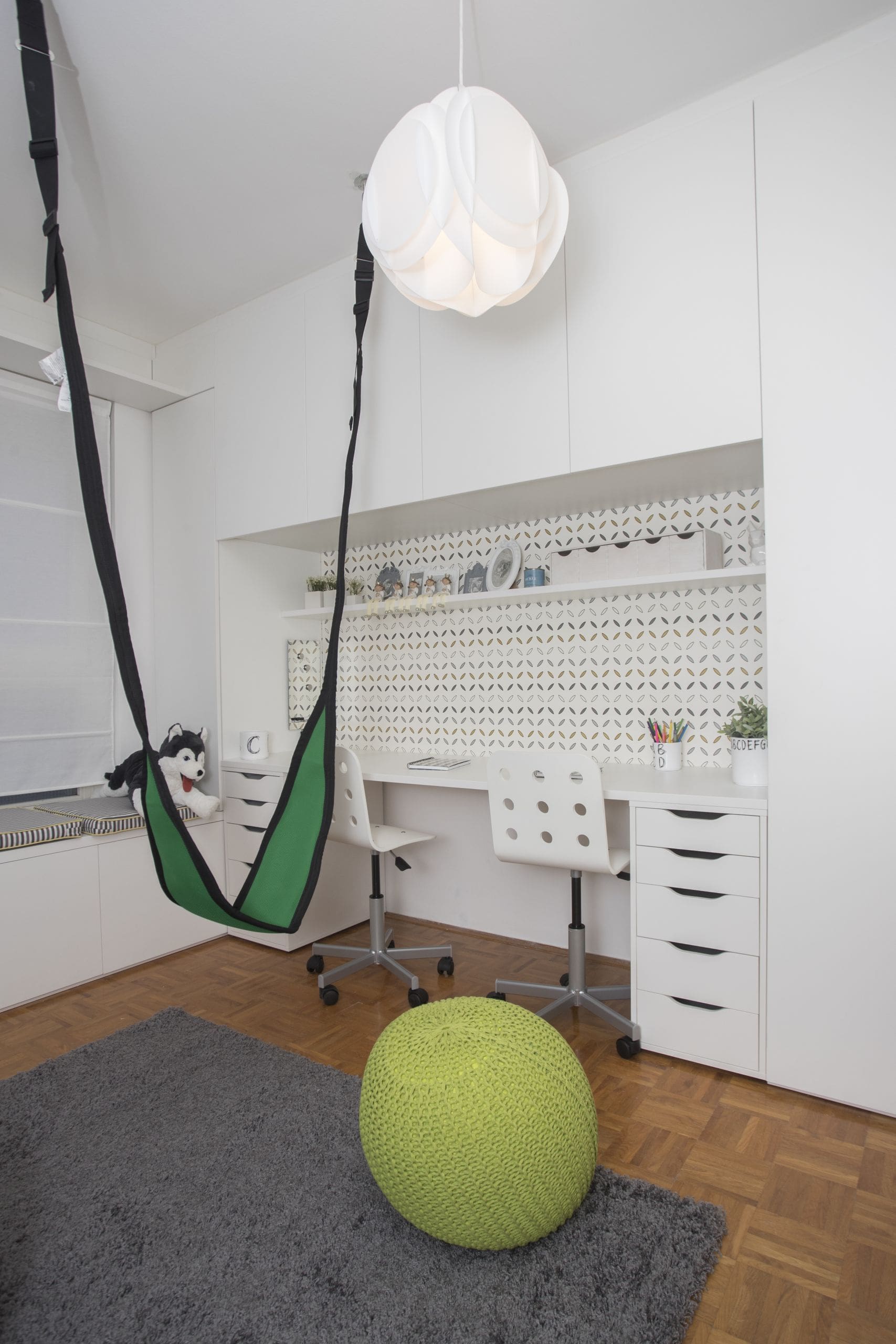 Zid do kreveta, onaj nasuprot tv jedinice, zamišljen je kao radni kutak. Prostor ispod prozora iskorišten je kao mjesto za druženje, a središnji dio je ostavljen za igru.