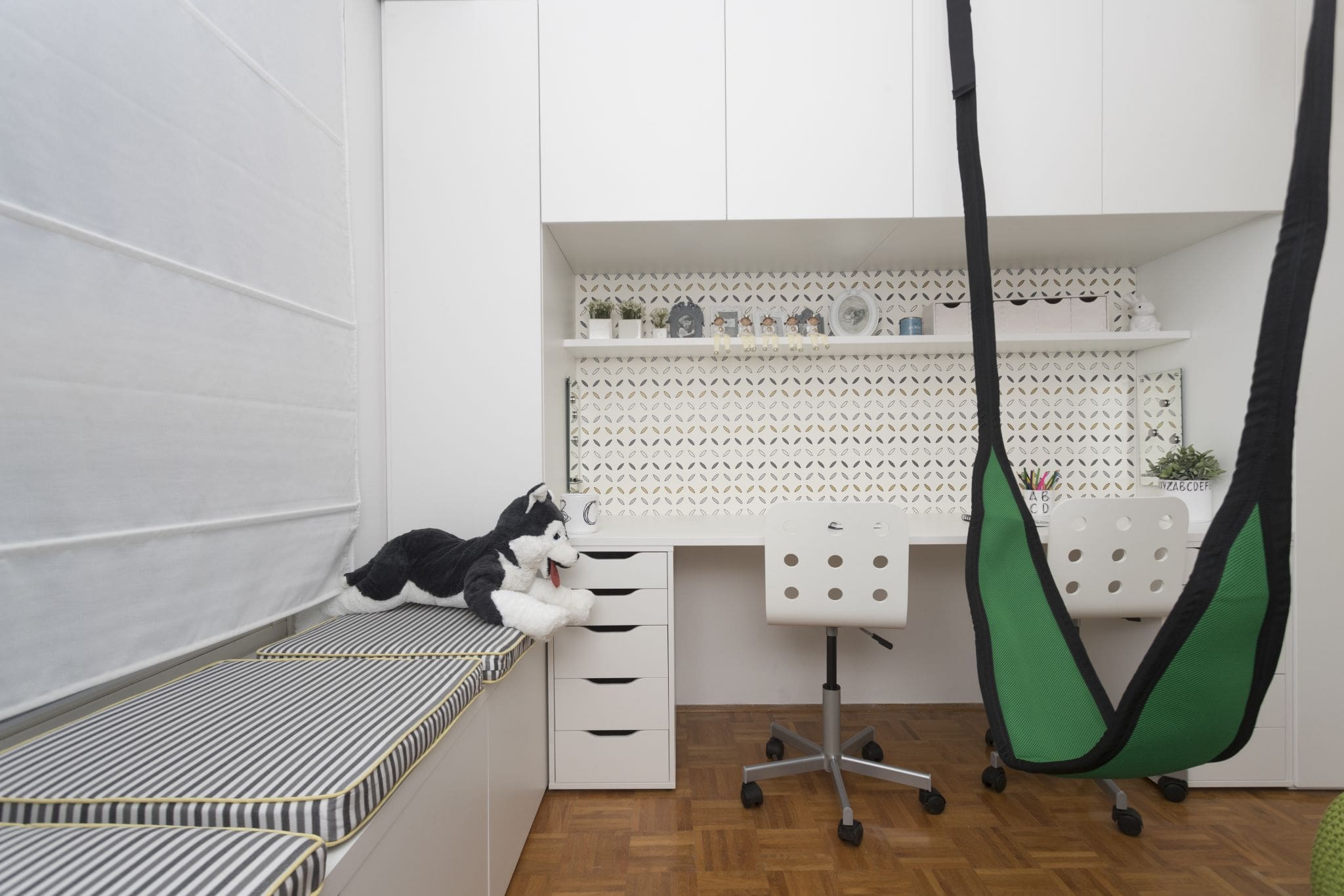 Prostor ispod prozora iskorišten je za klupicu na kojoj se može igrati, družiti, gledati tv ili čitati. Unutar klupice su ormari, koji se, kao i svi drugi, otvaraju na potisak. Ovaj kutak čini sobu stilski znatno zanimljivijom, baš kao i detalji koje su djeca sama dodavala.