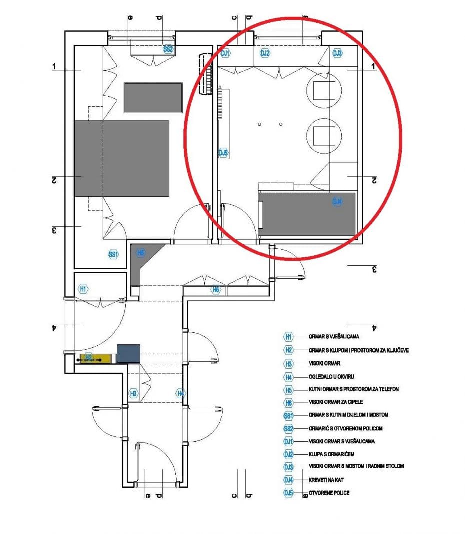 Razmještaj je osmišljen tako da na ulasku s jedne strane tv zid s policama, a na drugom kreveti. S obzirom na kvadraturu i razne druge funkcije koje treba zadovoljiti, odlučeno je da to budu kreveti na kat.