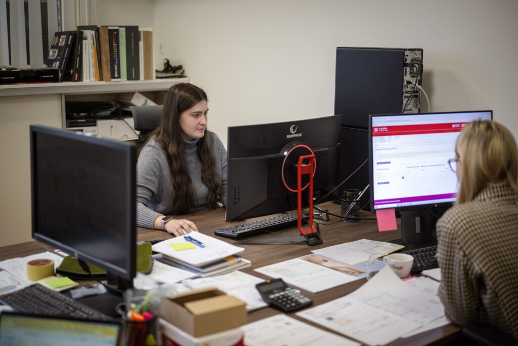 Radni je dan, u uredu je živo. Dolje u radionici čuju se strojevi. Jedni kroje, drugi slažu, Karla tu i tamo skokne dolje pa se vraća za kompjuter. Taj ritam joj je prirodan.